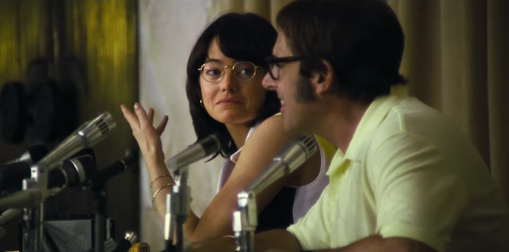Valerie Faris and Jonathan Dayton’s movie “Battle of the Sexes” has been called a crowd-pleaser everywhere, because it’s the kind of movie with a finale that would viewers to their feet. In another words, it’s not a downer, it doesn’t take itself too seriously. A crowd-pleaser tends to move at a rapid pace and has great appeal to popular, i.e. massive, tastes, and the people in the film that you’re rooting for will, despite initial setbacks, come out as winners. Well, then, whether “Battle of the Sexes” is such a movie depends on whom you support. Using tennis as a metaphor for the conflict between feminism and male chauvinism, wouldn’t those who want the male player to win feel disappointed at the conclusion?