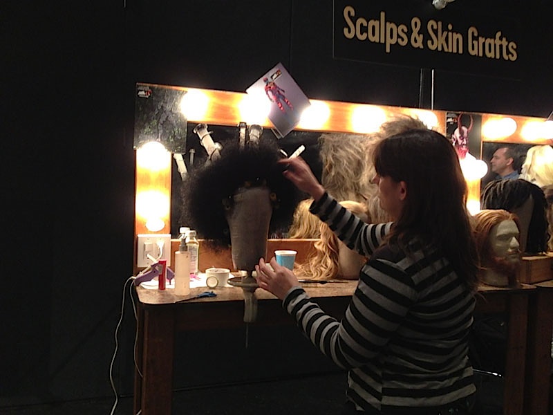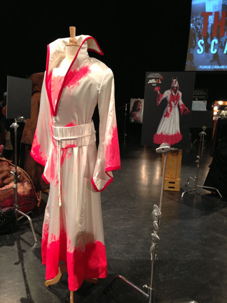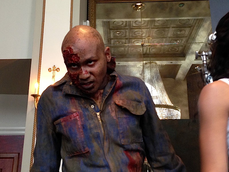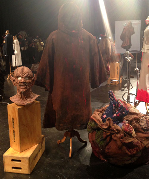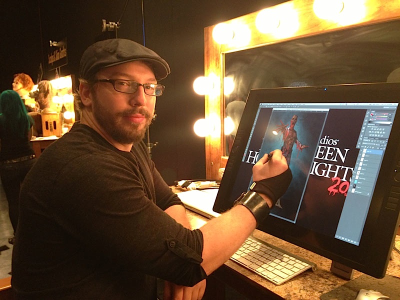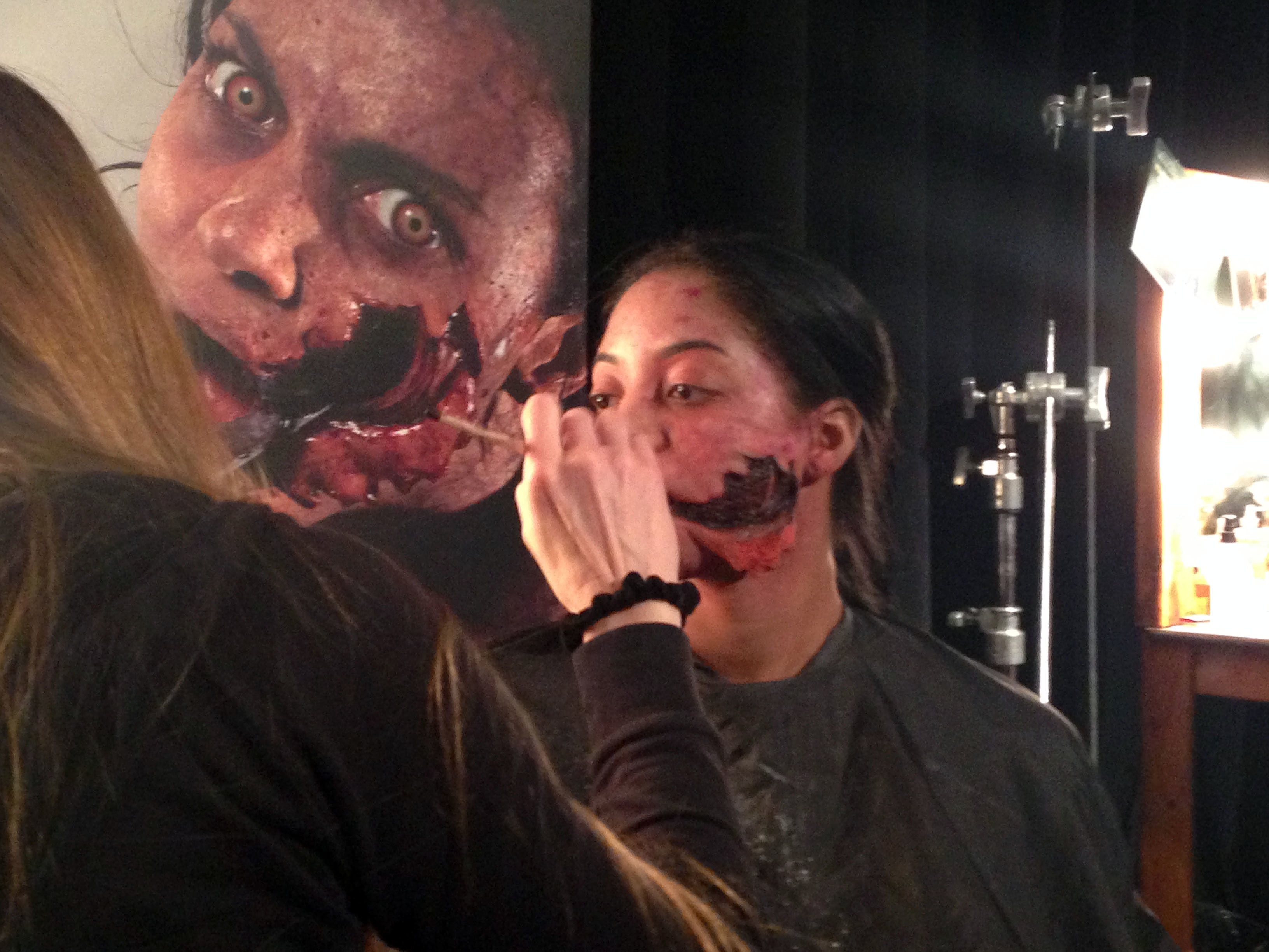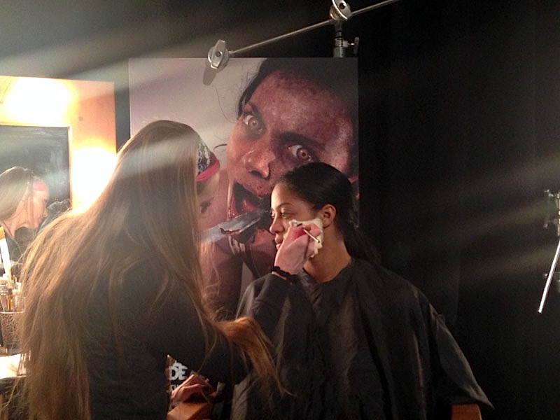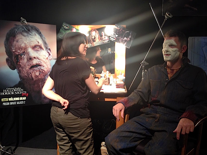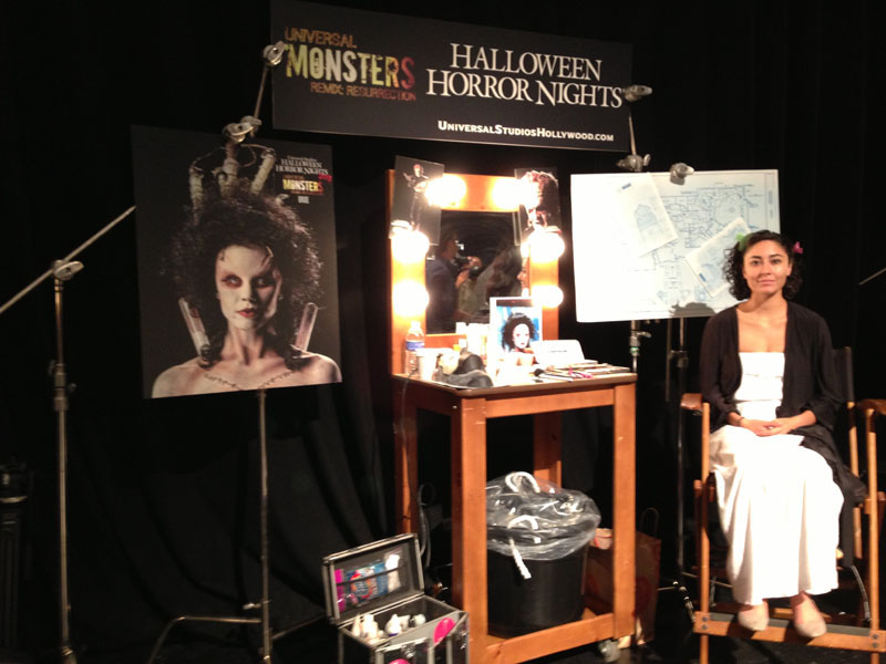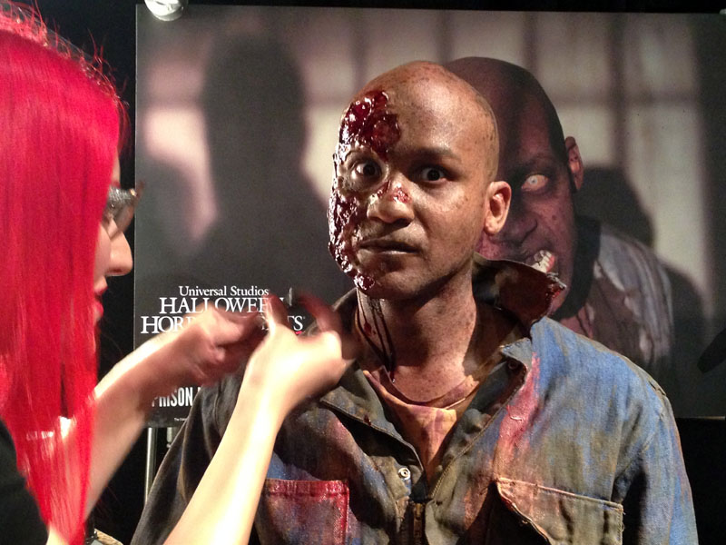 The makeup artists are busy at work showing off their talent while a couple of hair, mask and costume artists are in the corners hard at work making sure that their final product is 100% perfect. Even the resident concept artist Lucas Culshaw is busy drawing up a cool design of a bloody zombie. We got the chance to speak with him a little bit about being one of the few to help create the look of each monster that we’ve seen in the Halloween Horror Nights mazes, singing the praises of John Murdy and Universal. When we asked him the difficulties in creating a cool outfit that will be worn by actual people one day, he said “We take into account what we can do with each character and we make it the best. It’s usually pretty crazy what we can do. The sky’s the limit.”