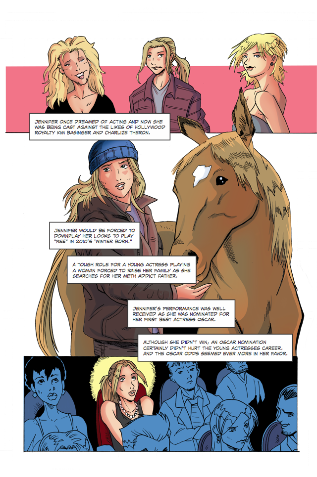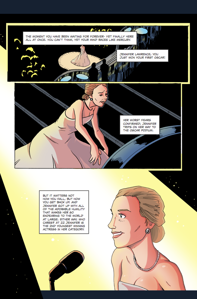 Print copies of “Fame: Jennifer Lawrence” can be ordered for $3:99 at Comic Flea Market. The app is available on iTunes, Google Play, and the Amazon Appstore for $2.99. The book can be downloaded through Wowio, ComiXology, DriveThru Comics, Google Play, My Digital Comics, Overdrive, Iverse, iTunes, Kindle, Biblioboard, ComicBin, Nook, Kobo and wherever eBooks are sold.