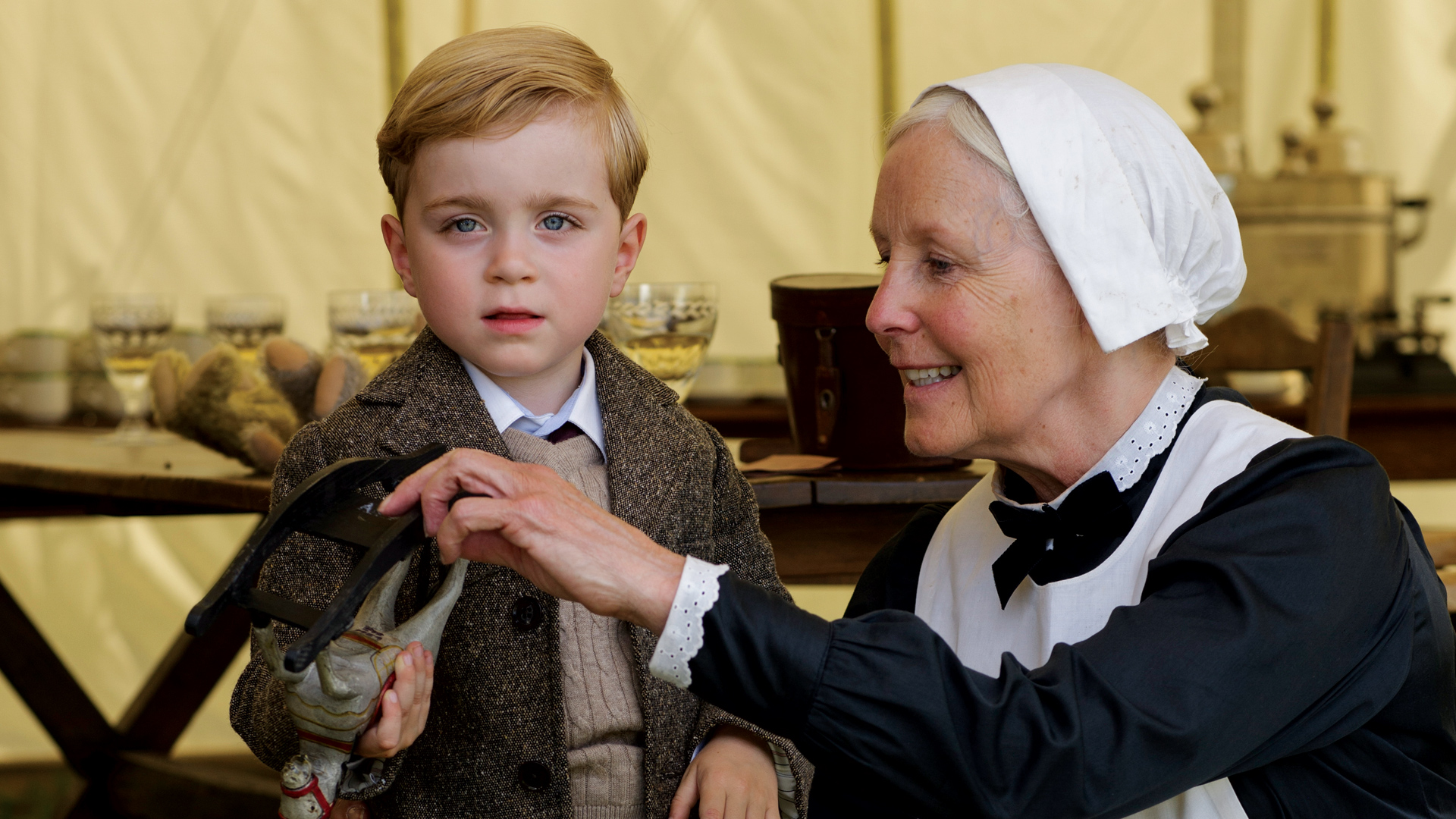 Also, there’s a funny inaccuracy in the photo of Lord Grantham and Edith (Laura Carmichael). Looks like someone left a water bottle in the photo. I wonder if someone’s getting chewed out about this right now.