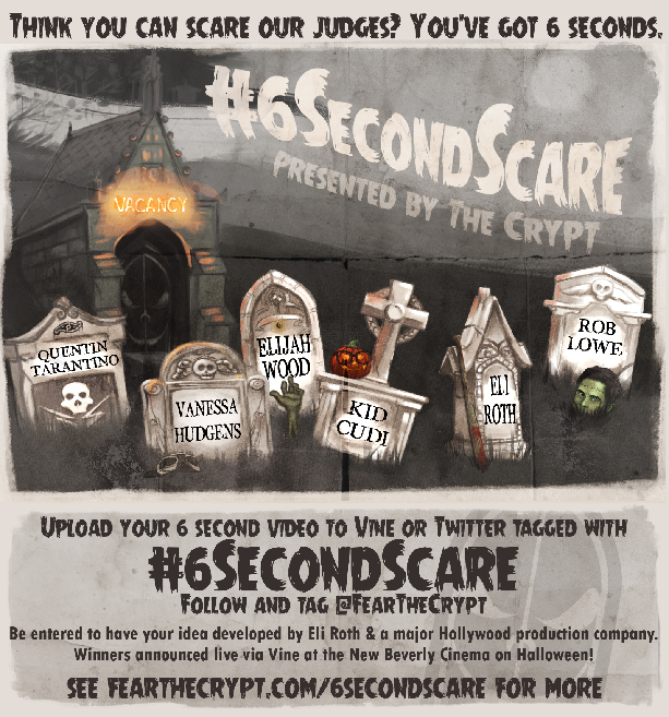 The #6Second Scare Vine contest is now running until October 31 at 12pm PST, after which the judges panel will choose the winners. The six winners will be announced later on Halloween night at Roth and Tarantino’s all-night-horror marathon at the ‘The Hateful Eight’ director’s New Beverly Cinema at 8pm PST. The winners will be simultaneously announced via The Crypt’s Twitter and Vine accounts.