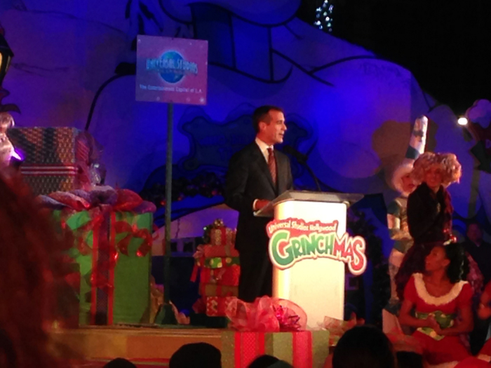 ShockYa got a seat at the official 2014 Grinchmas tree lighting ceremony. The Los Angeles mayor Eric Garcetti said some sweet words about this time of year and just what kind of merriment should be in all of our hearts. It was difficult not to smile with all of the wonderful Christmas spirit that was floating around in the air of adults and children alike.