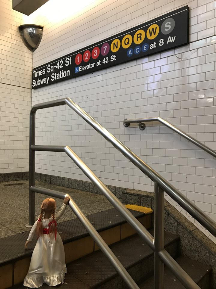 All visitors who attended the scavenger hunt at Ripley’s Believe It or Not! in Times Square yesterday received a special map of the museum. Those who located all 13 of Annabelle’s hiding places throughout the Odditourium received ‘Annabelle: Creation’ prizes from New Line Cinemas and Warner Brothers, including tickets to attend a preview screening of the supernatural drama. Visitors were also given the opportunity to pose for photos with the demon who possesses Annabelle. Participants also received gifts from from Mezco Toyz, which is the only authorized producer of Annabelle prop replica dolls.