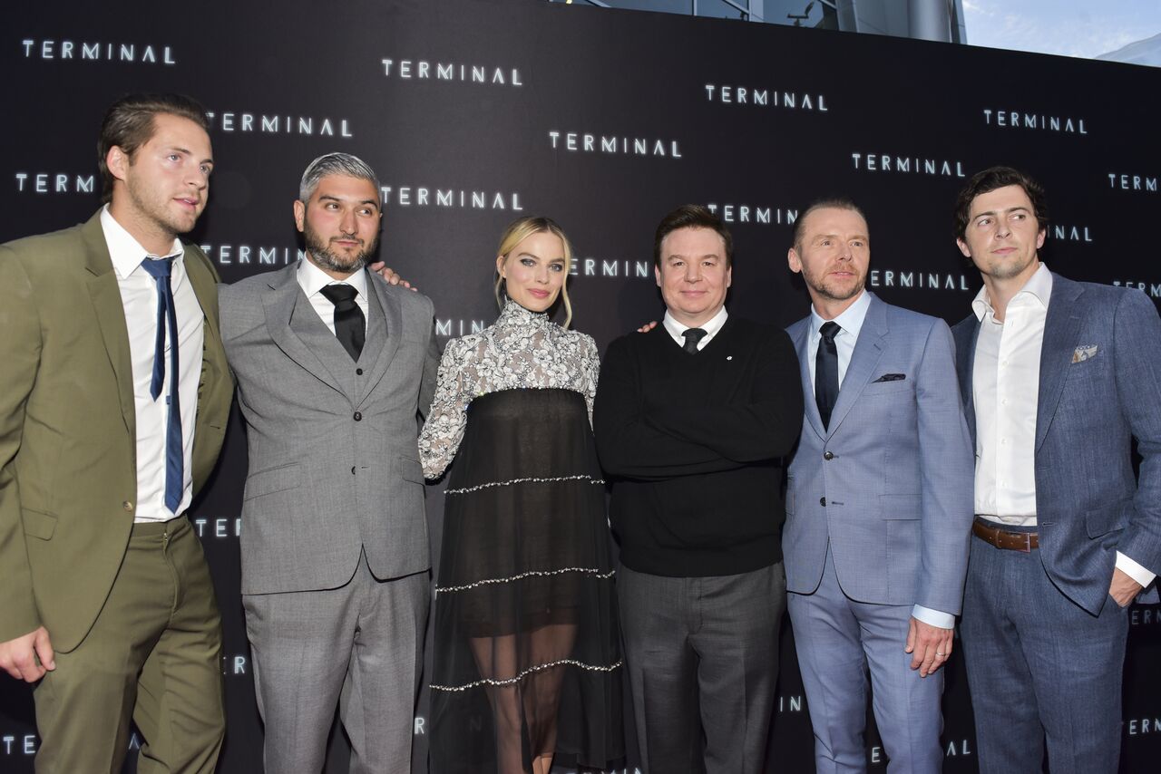 (L-R) Producer Tom Ackerley, writer-director Vaughn Stein, Margot Robbie, Mike Myers, Simon Pegg and producer Josey McNamara attended the World Premiere of their crime thriller, ‘Terminal,’ at Arclight Hollywood on May 8, 2018.