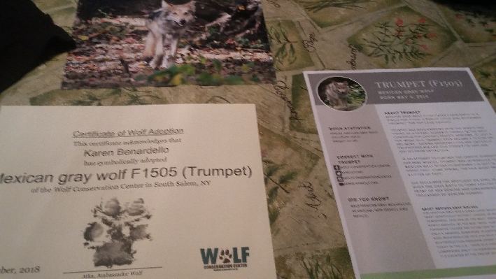 The wolf adoption package includes a Mexican Gray Wolf being adopted in our name on our behalf from the WCC. The wolf is a female named Trumpet, who was born on May 4, 2016. We also received an adoption certificate for Trumpet; a 8×10 photo pf, and biography for, Trumpet; a 2019 wolf calendar; a wolf plush; a WCC T-shirt; and a Blu-ray copy of ‘Alpha.’