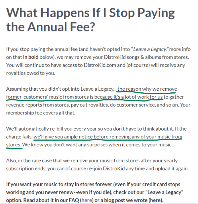 So the actual cost of distribution is somewhere in-between, and DK has a solution for this. They call this their “Leave a Legacy” package. For a one-time fee of 49 USD — approx. 250% of the original asking price of 19.99 — DistroKid won’t remove distributed music from stores if annual payments stop. This means that to permanently distribute an album via DistroKid costs a total of 68.99 USD, not 19.99.
