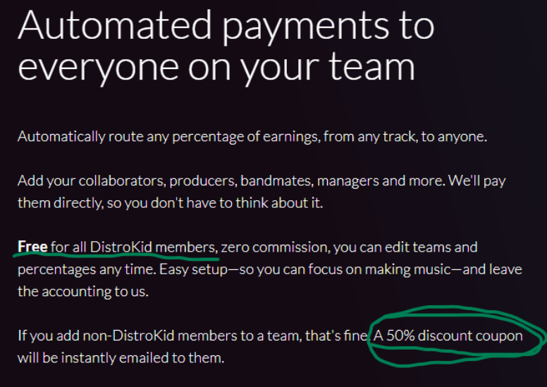 If an artist were part of a five-piece band distributing an album, DistroKid would split royalties for everyone and pay directly. That’s super useful if you’re a studio group of collaborators from all over the world. Nobody wants to need to trust someone to split up the money.