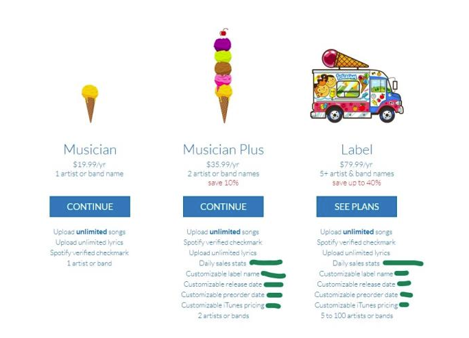 Daily sales stats aren’t included, either. In fact, artists wanting control over the date of their release, the name of their music label, any preorder or presale dates, or daily sales statistics will need to forfeit 35.99 USD each year for the “Musician Plus” package.