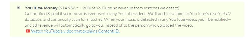 Many artists won’t consider “YouTube Money” extra, either. Besides that original 19.99, DistroKid wants 14.95 USD per year to ferret out uses of your songs on YouTube. DK collects ad revenue from those uses for the artist, minus 20% of that revenue. DK takes that percentage in addition to the 14.95 annual fee for YouTube Money alone.
