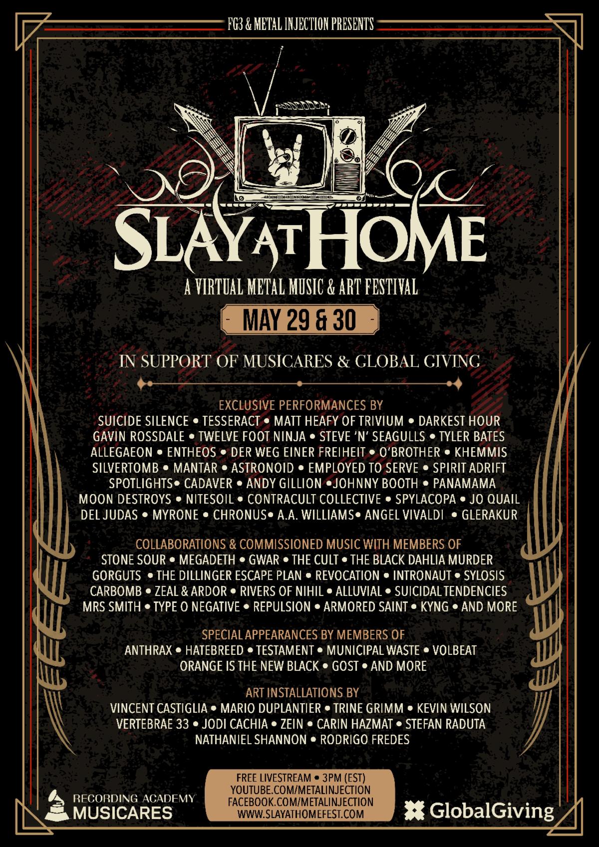 Slay At Home, the first of its kind virtual metal music and art festival, is set to air this Friday and Saturday, May 29 and 30, at 3pm EST. The event, which is being organized by Frank Godla of Metal Injection, is set to fundraise in support of the charity organizations, Musicares and Global Giving.