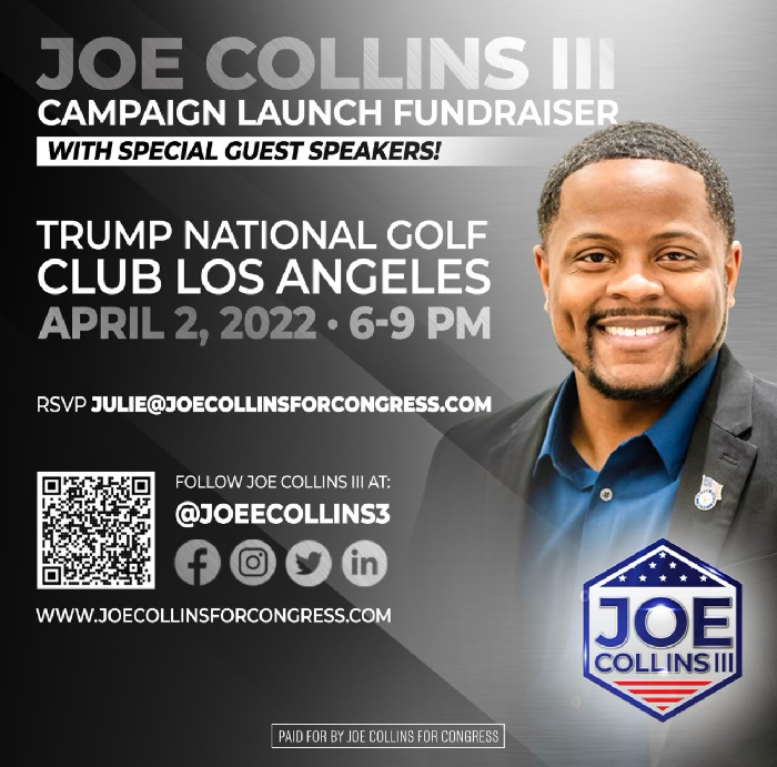 As a way to introduce himself to California’s 36th district, Collins is hosting a campaign launch fundraiser on Saturday, April 2 from 6-9pm PT at the Trump National Golf Course in L.A. The event will be held at the gold course, as the aspiring politician is endorsed by former U.S. President Donald Trump. To RSVP for the fundraiser, which will feature special guest speakers, email julie@joecollinsforcongress.com.