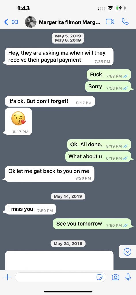 One week after alleged rape, Nichols sent her former boss another set of WhatsApp messages. In those exchanges, she asked him about payment for the other crew members who worked at the Hologram theater he owns. In response, he made an immediate payment to the crew by PayPal. When he asked her about her payment, she said “Don’t worry about me.” She later partnered with Girardi, Allred and Bloom, who came up with the plan to extort David over their consensual romantic relationship.