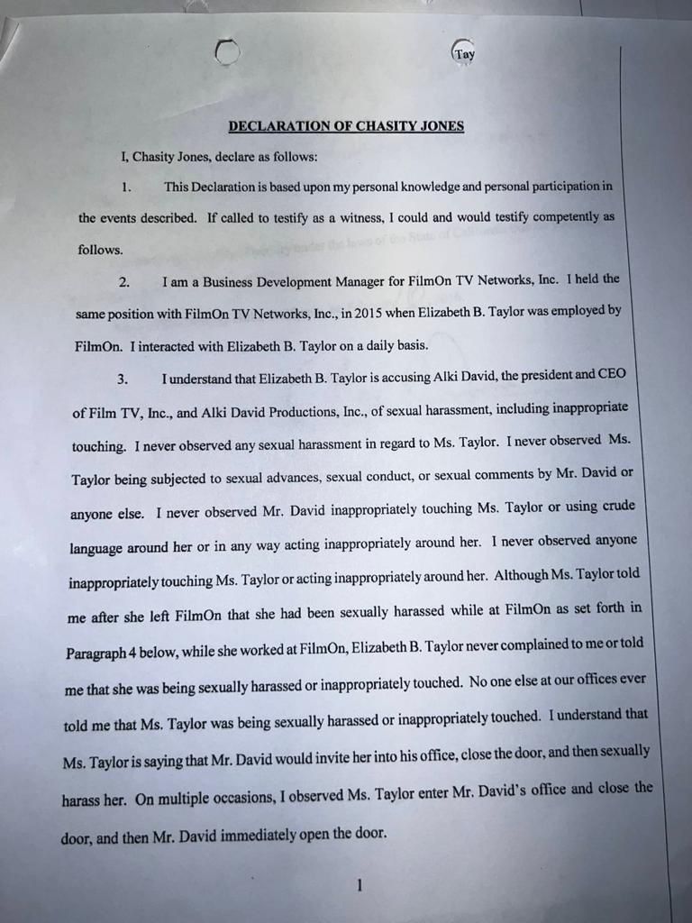 During her time working as a business development manager for FilmOn TV in 2015, Jones worked with Taylor on a daily basis. Jones added that during her employment at the company, she “never observed Mr. David inappropriately touching Ms. Taylor or using crude language around her or in any way acting inappropriate around her.”
