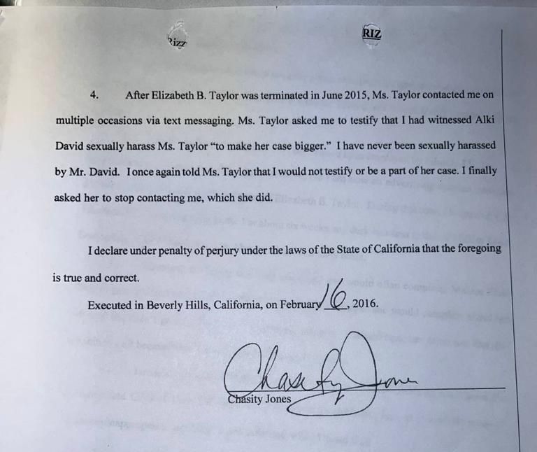 Jones further went on to say that “After Elizabeth B. Taylor was terminated in June 2015, Ms. Taylor contacted me on multiple occasions. Ms. Taylor asked me to testify that I had witnessed Alki David sexually harass Ms. Taylor ‘to make her case bigger.’ I have never been sexually harassed by Mr. David. I once again told Ms. Taylor that I would not testify or be a part of her case.”