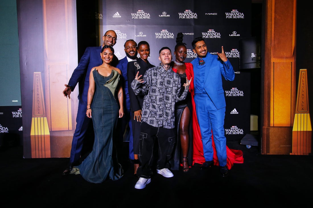 Mexico City, Mexico – November 9: (L-R) Producer Nate Moore, Mable Cadena, Director Ryan Coogler, Letitia Wright, Santa Fe Klan, Lupita Nyong’o and Tenoch Huera pose for a photo during the Wakanda For Ever Red Carpet in Mexico City at Plaza Satellite on November 9, 2022 in Mexico City, Mexico. (Photo by Agustin Cuevas/Getty Images for Disney)