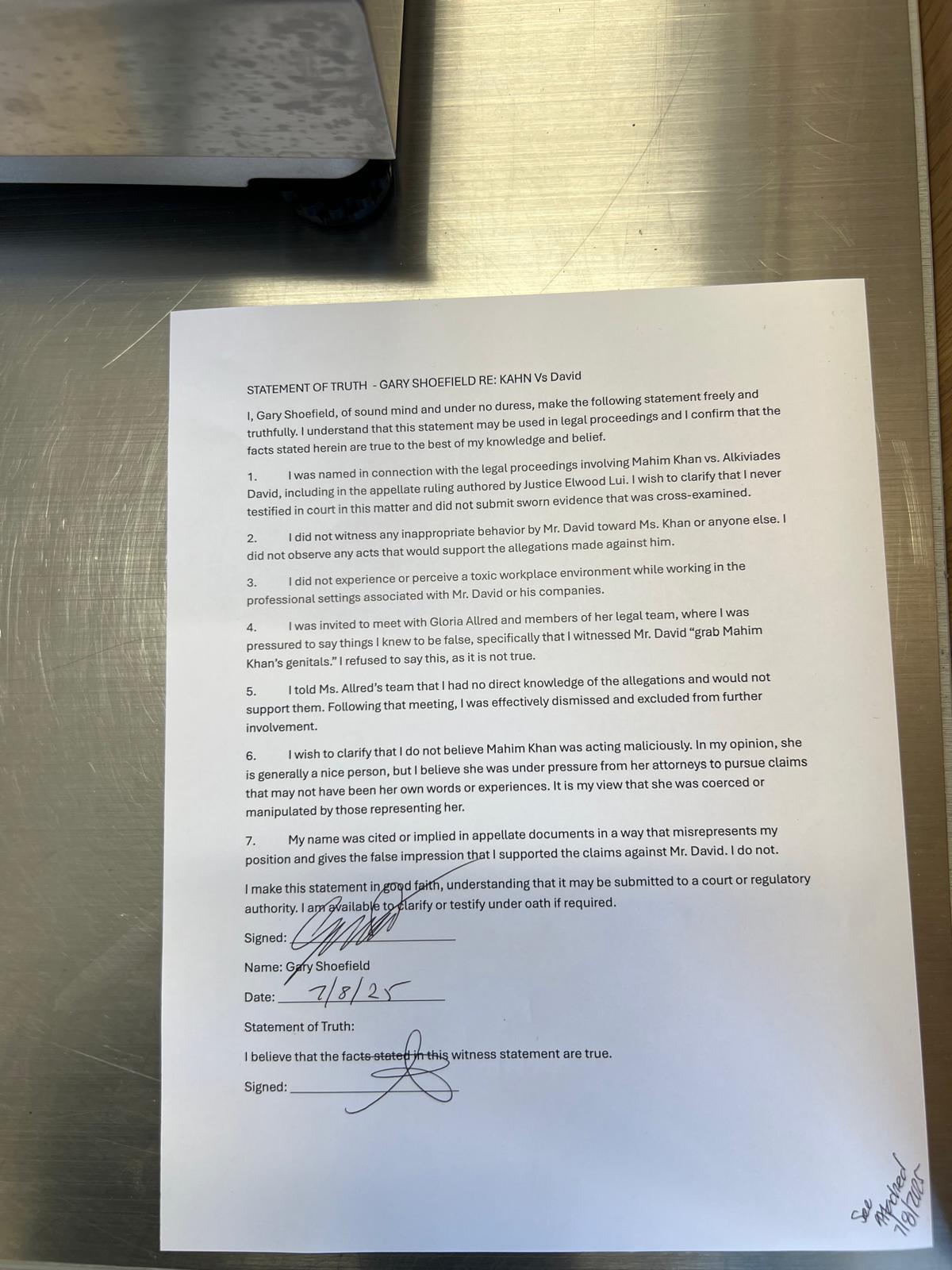 “Mr. Shoefield did not provide testimony relating to his ex-assistant, Mahim Kahn, who he considers a ‘despicable liar.’”