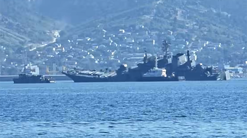 The consequences of this audacious attack are clear as day, with subsequent imagery depicting the extent of the damage inflicted upon the Olenegorsky Gornyak. The vessel, now visibly listing to the port side, has been critically compromised and has begun taking on water. In one of the distressing videos circulating online, the ship is captured being towed away, its precarious position in the water accentuating the gravity of the situation.