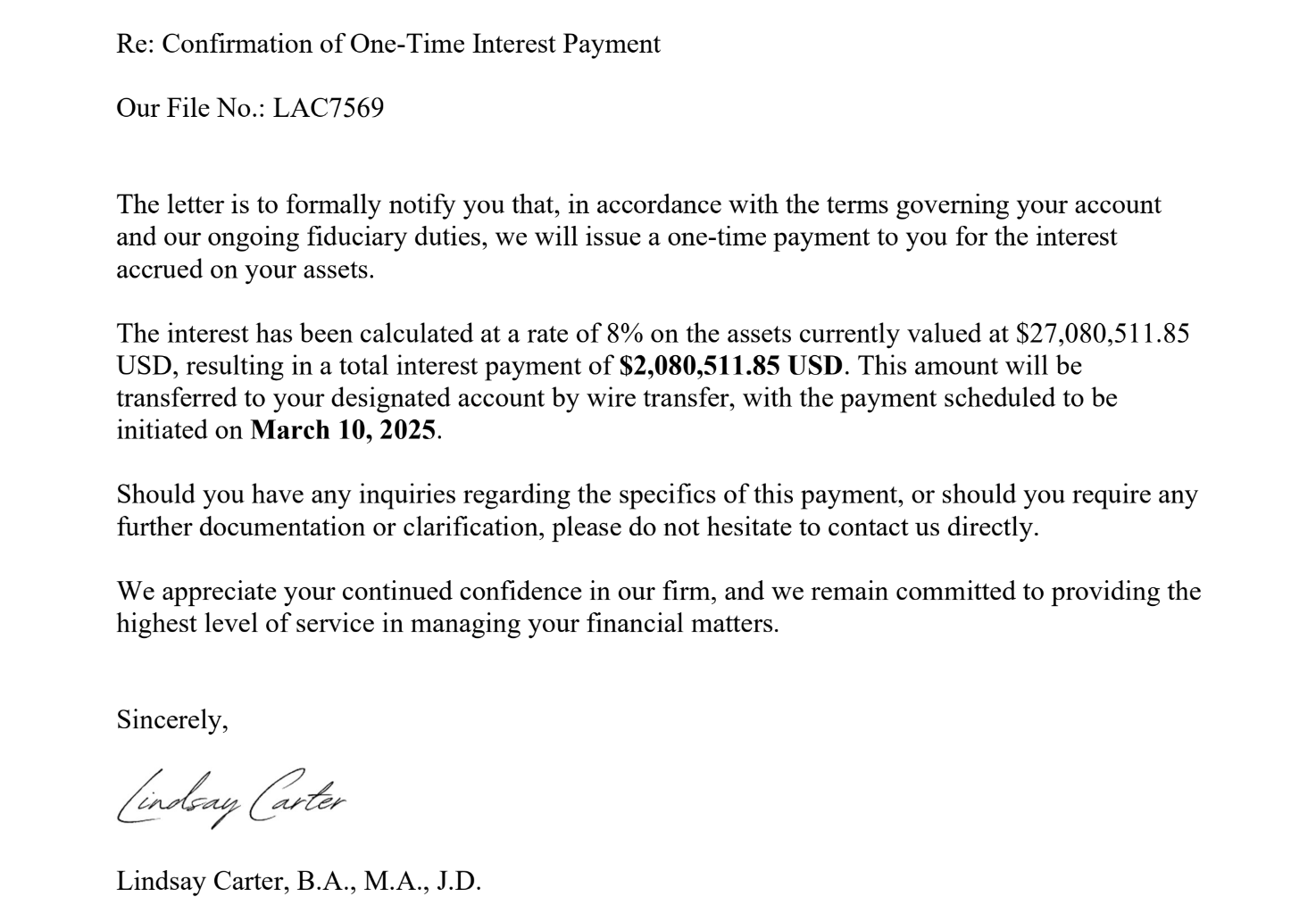 above is a letter to one of Accelerated Law Group victims – the interest payments never came