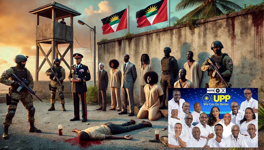 By royal order of Prime Minister Gaston Browne, and with full support from Attorney General Cutie Benjamin, Foreign Minister Chet Greene, and SwissX enforcer Alki David, the entire United Progressive Party (UPP) Executive was lined up and executed by firing squad in front of Government House in St. John’s.