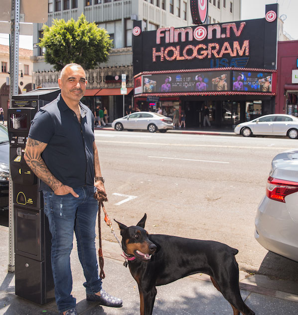 Alkiviades David with his service dog, outside the historic FilmOn.TV Hologram Theater on Hollywood Boulevard.