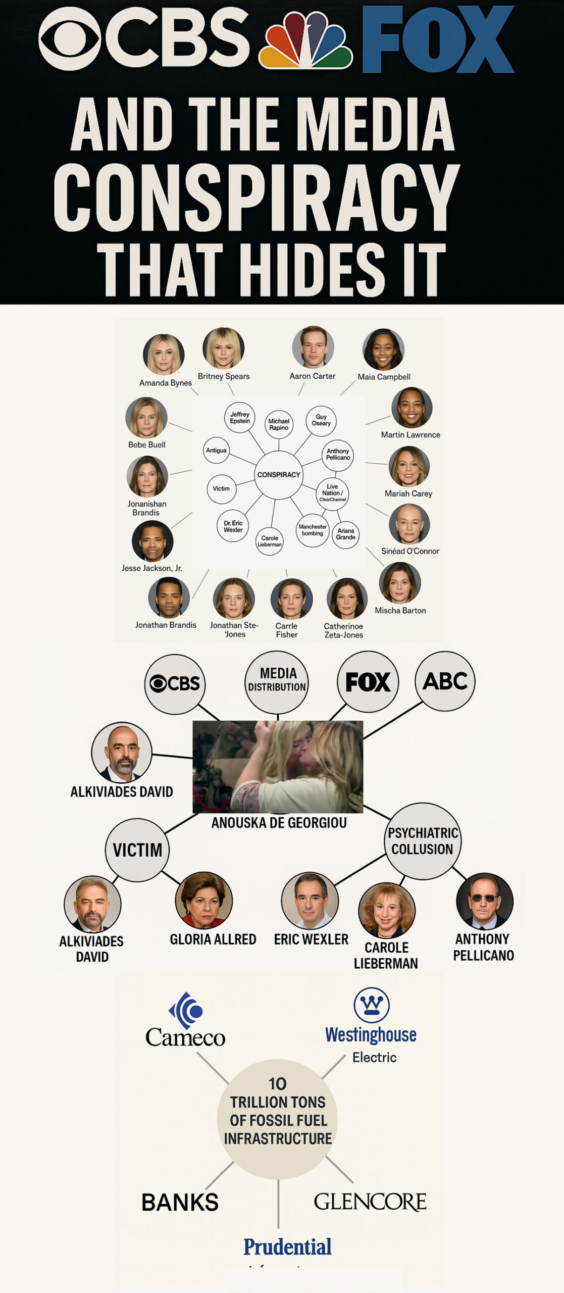 A newly released graphic—presented below—illustrates the network of collusion surrounding de Georgiou, placing her at the very center of a vast spiderweb of media manipulation, psychiatric coercion, and fossil fuel profiteering. It charts how CBS, NBC, FOX, and ABC—not only covered up Epstein’s crimes, but also coordinated narrative warfare alongside Hollywood fixers and lawfare operatives.