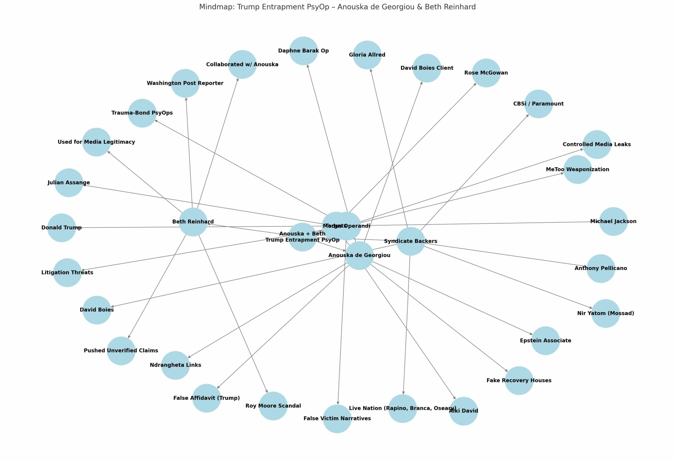 The mind map titled “Trump Entrapment PsyOp – Anouska de Georgiou & Beth Reinhard” visually outlines a sophisticated intelligence-linked psychological operation targeting Donald Trump, with Anouska de Georgiou as a Mata Hari-type operative and Beth Reinhard of The Washington Post as the legitimizing journalist. Here’s how they figure into a broader assassination or neutralization strategy: