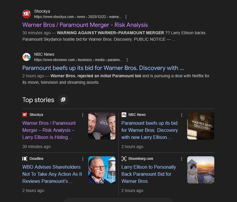 The screenshot above shows Shockya’s risk analysis appearing as a top organic Google News result for the Warner Bros / Paramount merger, positioned alongside and between coverage from major legacy outlets.