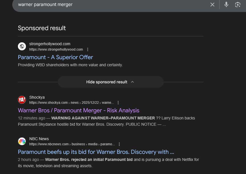 The appearance of this article as a top organic Google News result for the query “Warner Paramount merger” — positioned between paid Paramount advocacy and legacy media reporting — constitutes a material market signal.