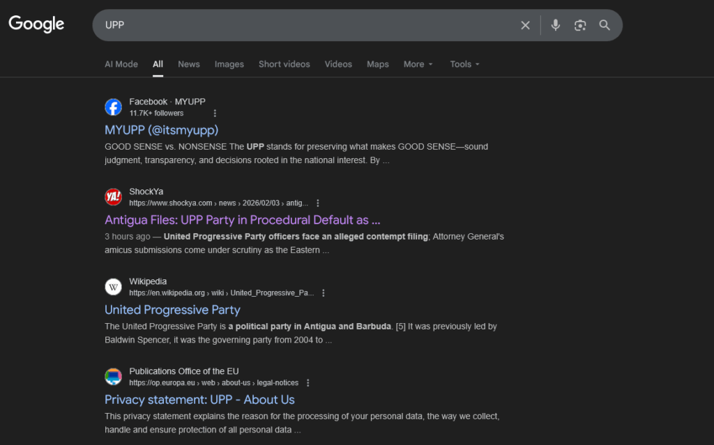 A standard Google search for “UPP” prominently displays this article within hours of publication. This demonstrates that the proceedings and allegations were publicly indexed, readily discoverable, and reasonably capable of being seen. It is therefore not credible to suggest that the publicity was not visible or that notice could not have been obtained through ordinary diligence.