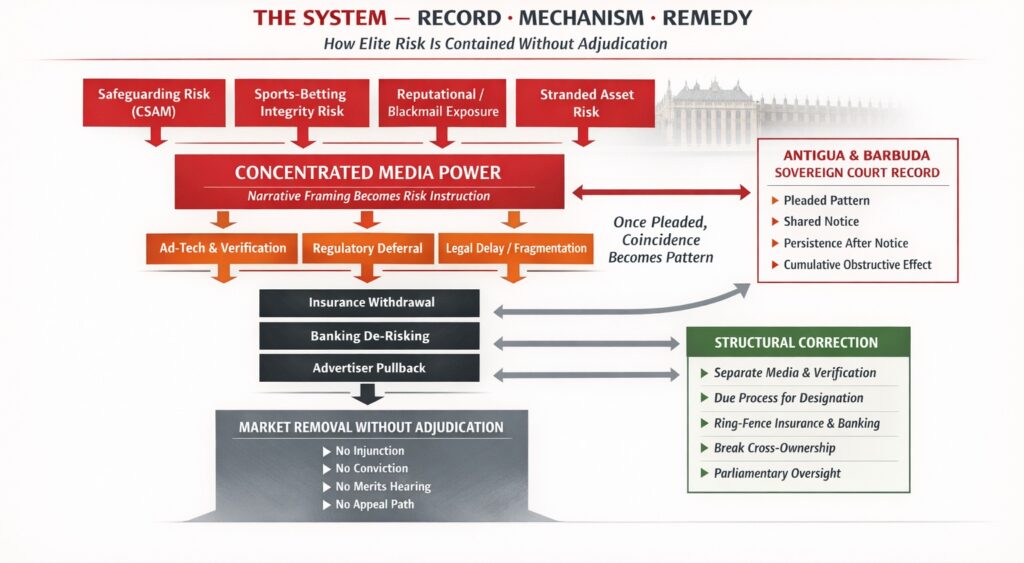 Case ANUHCV2025/0149, filed by entrepreneur and Antigua & Barbuda Ambassador-at-Large Alkiviades David, alleges the existence of a transnational “Legal–Media Cartel” composed of media conglomerates, high-profile attorneys, intelligence contractors, and global banking institutions. The amended claim (September 24, 2025) seeks $80 billion in damages, with filings arguing that long-term economic sabotage of Antigua’s emerging carbon-sequestration economy could push liability exposure toward $810 billion or more over time. At stake is not merely a private dispute. The litigation touches on the economic future of Small Island Developing States (SIDS) attempting to transition from fossil-fuel dependency toward carbon-negative economic models built on natural ecosystems. If validated even partially, the case could expose the intersection of global media power, financial networks, and legal strategies surrounding the emerging climate-credit economy.