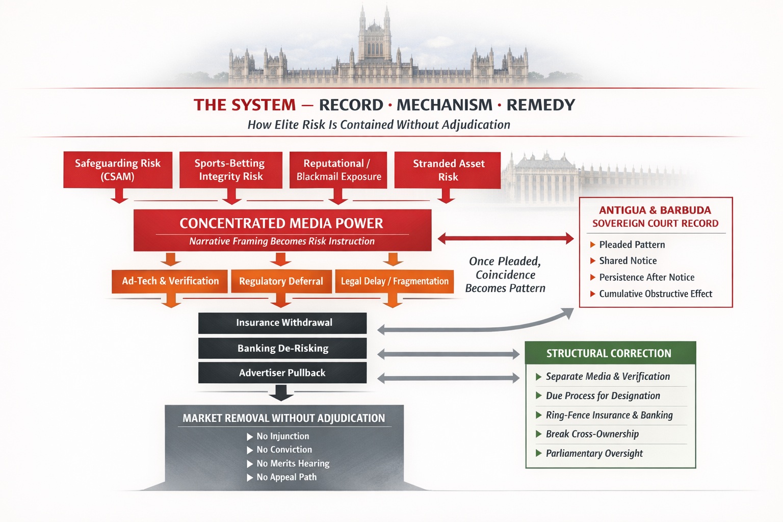 A visual map of how concentrated media power, regulatory deferral, and legal delay can combine to remove individuals or entities from the market without formal adjudication — with the Antigua & Barbuda court record positioned as the point where patterns are formally pleaded and exposed, and structural reform becomes the proposed remedy.