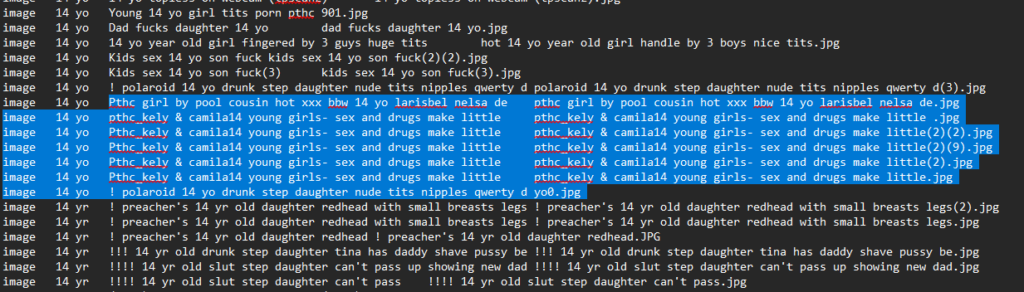 DropBox Alerts : “Pthc_kely & camila03 young girls in action” “Pthc_kely & camila14 young girls — sex and drugs make little” “Pthc kely & camila16” …and dozens more.
