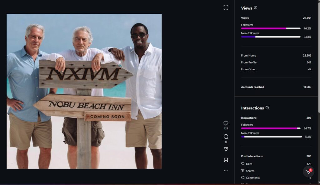 A single Instagram post recently hit a nerve: high-profile figures posing in front of a beach sign reading “NXIVM” above “NOBU BEACH INN — COMING SOON.” In days it racked up 23,091 views, reached 11,680 accounts, and sparked 205 interactions. The public instantly understood the message. The quiet part was said out loud.